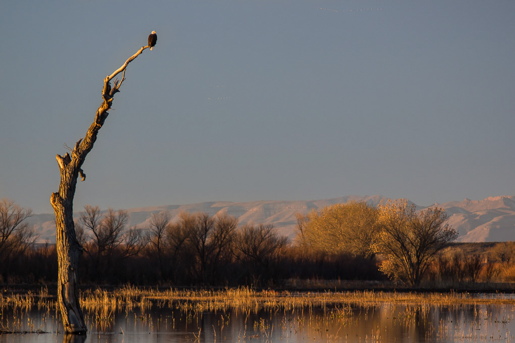 I love the photo, but did decide to play with the sky a bit. Personal preference here... I like my sky to be just a little more blue. I used the adjustment brush in LR and just lowered the Temp White Balance to -10 adding just a touch of blue. It's a balancing act, because you wouldn't want to go too blue removing the warmth of the overall photo. You can decide if you like it or not. I thought it made the eagle stand out just a bit more. |
