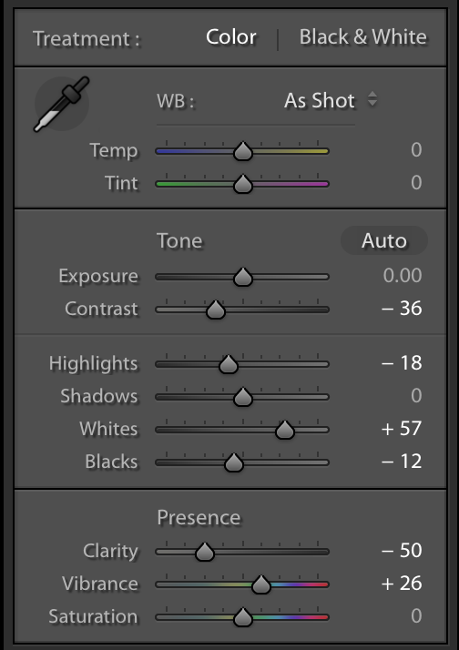 I love the composition of this shot. For me, I have a different taste in post processing. I pulled it into LR and made some adjustments to soften the look. I am also trying something new: I took a screen shot of my adjustments so you can literally see the changes I made. Whether you like them or not is up to you. It's personal taste. |