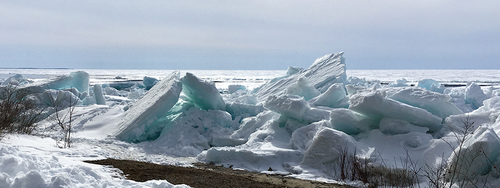 I love the colors in the ice and seeing how high it can get. I find the dead sticks distracting. I recropped it and cloned out some of the sticks to keep the focus on the ice. You can decide if you like it. |