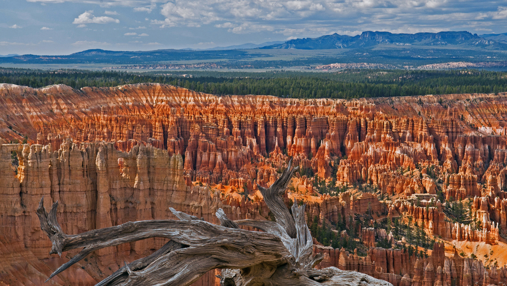 I love Bryce Canyon. It's a beautiful park. I love all the layers except I'm not sure I am a fan of the dead tree in the foreground. I took the picture into PS Camera Raw. I used the adjustment brush to increase both the temperature and tint. I thought it blended a bit better. |