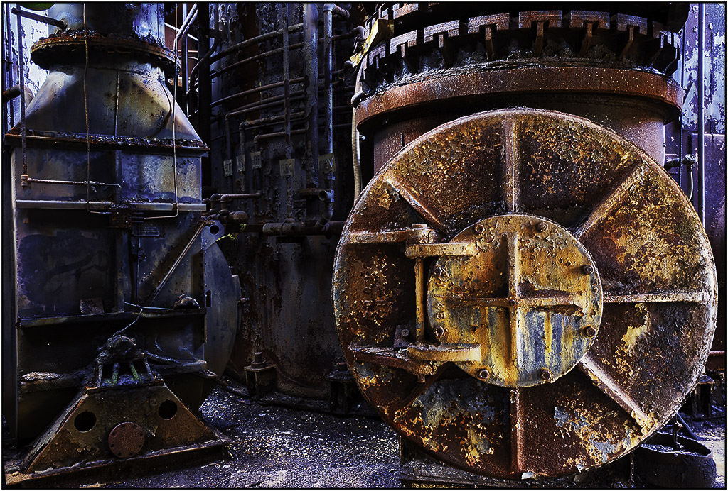 This is a real eye stopper. The colors are just great. The detail overwhelms me I tried darkening the center machine about 45% midtones and highlights and softenng about 3%.