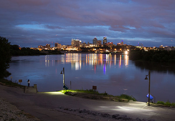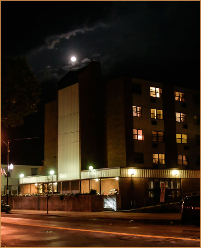 This is an interesting image. It is unusually sharp for being shot at f3.5. The perspective is abit off so I rotated the image slightly to the right. The moon adds interest here but my eye keeps jumping to the bright red light on the left side. Removing it as well as some of the black sky on the top makes a stronger image. A 6 pixel stroke, the color of the square windows on the lower part of the building was added. To see the stroke you will have to click on the tiny image to enlarge it. |
