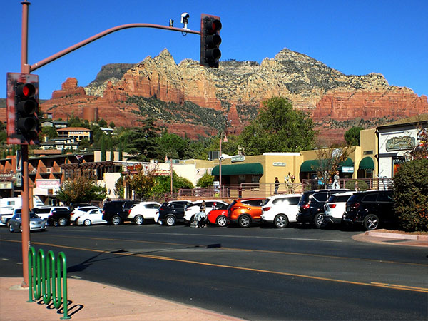 Walter, bright, colorful and sharp. My daughter is in Sedona now - one of her favorite places! Image was flipped to put the green bike rack in the left corner. Its adds balance to the green trees and awnings on the other side of the street. You were lucky the red cars were there. |