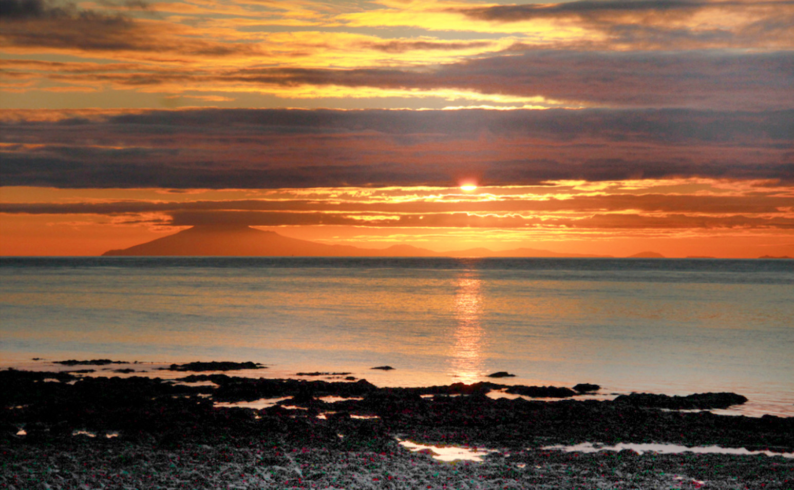 I love the colors and the volcano. I'm ambivalent about the blue sky at the top. |