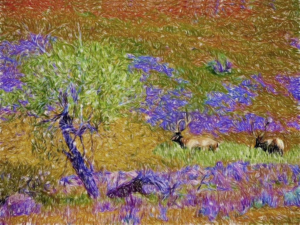 I really love this image. The brush strokes add a lot of excitement and interest and emphasize your textures. The elk are a great addition, both in interest and composition. You have just enough detail on them to make them stand out and make them readily identifiable.