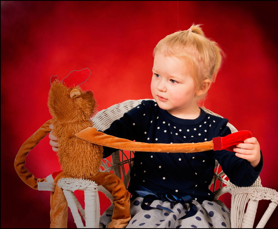 Celeste looks very sweet. I love her intrigued expression, as if she expect the toy to talk back. The toy's extra-long arm adds a nice touch of humor and frames Celeste's face.
