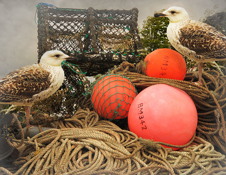 Between the colorful floats and the bright head of the seagull, the image feels just a little heavy on the right to me. It might be interesting to add something on the left to balance it. |