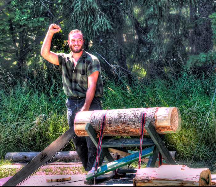Perfect timing on the shot! I really like the lumberjack's smile and gesture. Nice leading line with that huge saw.