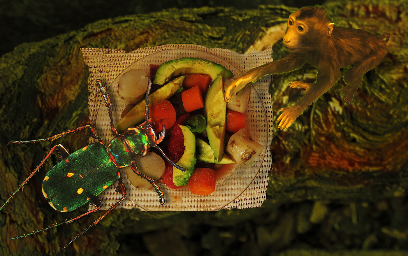 I love all the colors in your dinner (which looks yummy), and how they are echoed in the beetle.