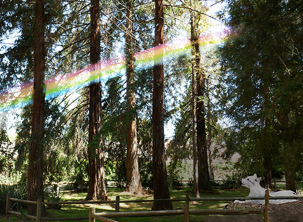Wonderful concept. I really like how the rainbow goes in front of some trees and behind others, though it would make more sense to me if it passed in front of the trees furthest away.