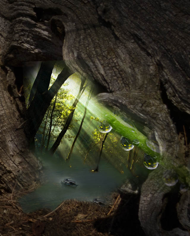 You might consider using different blending modes. The rainbow is translucent in the original, and it would be nice to see more of that in the final image. The attached is the rainbow portion of your final image masked in as 2 layers (one in screen mode, one in hard light) over the forest original. Hope that helps. |