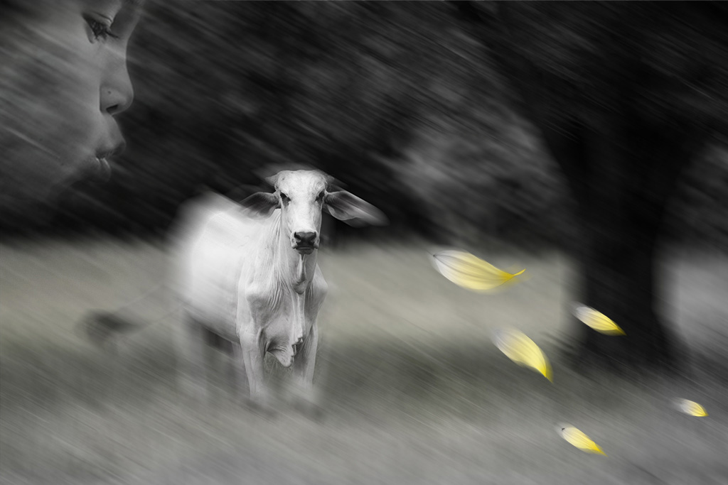 For me, the blur on the cow and the petals is spot on; it fits in perfectly with the motion of the air and feels a bit dreamy as well.