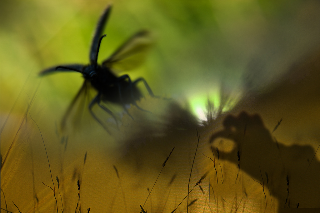 I've thought about this image a lot, and for me there is a bit of a disconnect between the shadow creatures. I think the chicken silhouette is very clever as a independent image. Looking at "Phobic", it feels as if there are two different stories taking place, one for the insect and one for the chicken. I can't see the story that involves both of them, maybe because the insect is flying away and the chicken is in profile. The title "Phobic" hints that maybe the viewer should be the one threatened, but since neither subject is facing the camera, it doesn't feel that way.