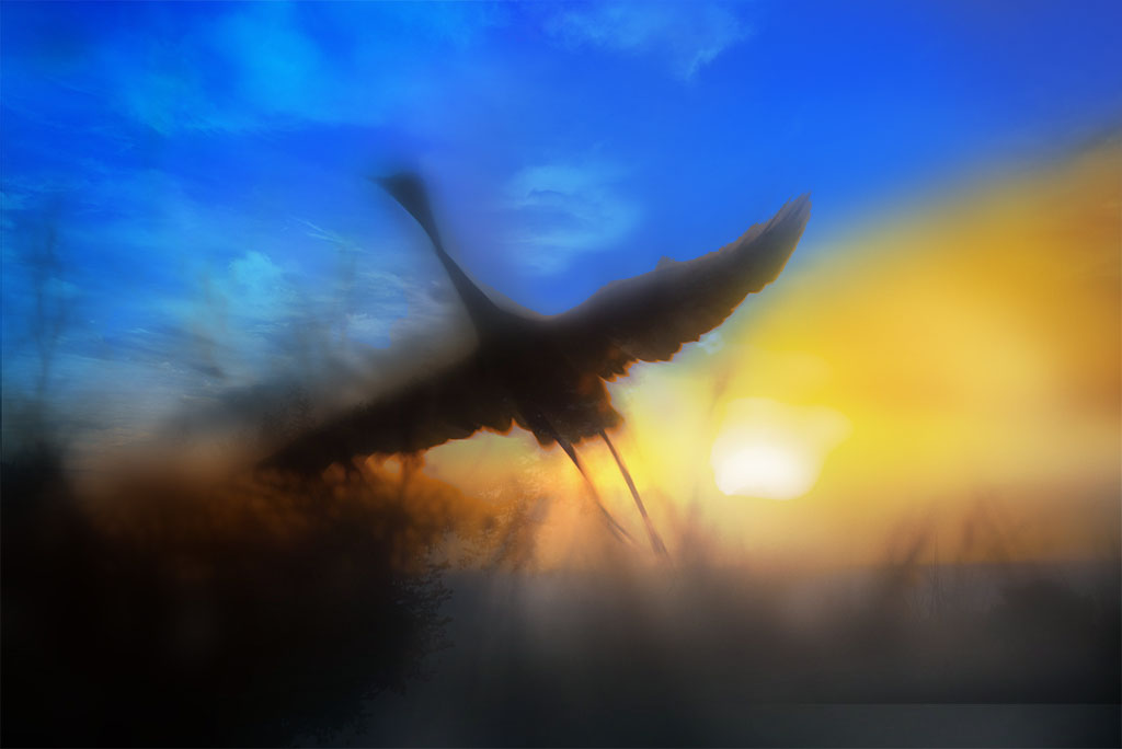 Personally, I love the blurriness of the bird and how it is so backlit that we see no details. It really gives me the feeling of motion, how when a bird suddenly flies by I have an impression of movement, but no recognition of detail.