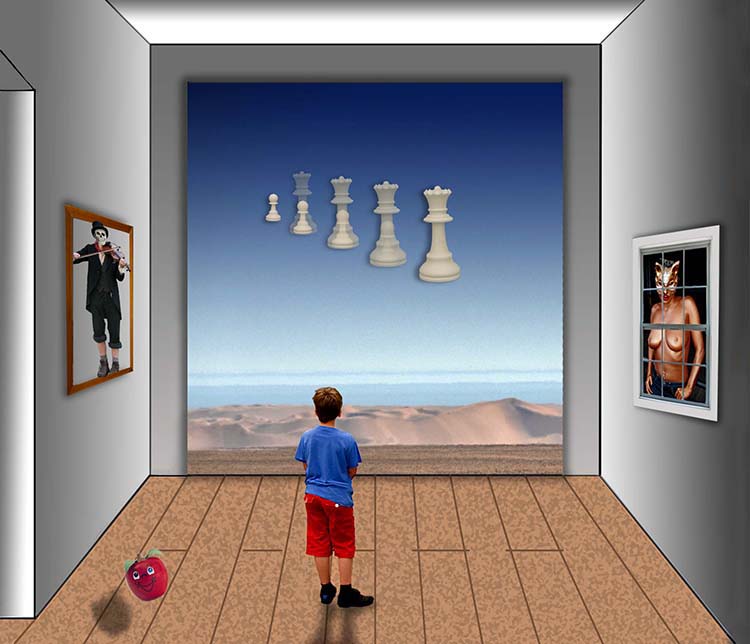 At first I thought the balance was among the boy, the chess pieces, and the pictures, and then I realized it was the boy, the bright ceiling, and the pictures, all framing the chess pieces. It feels very satisfying to move my eye around the circuit, wander into the center, and then go back around again.