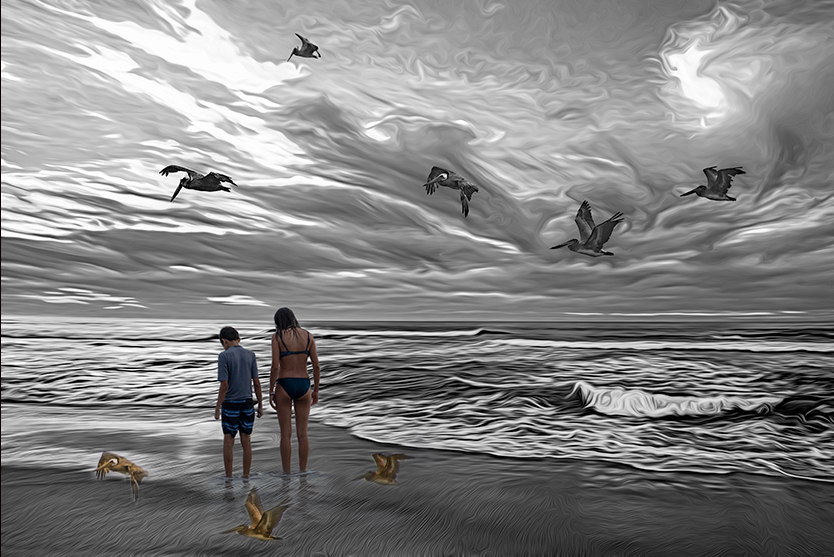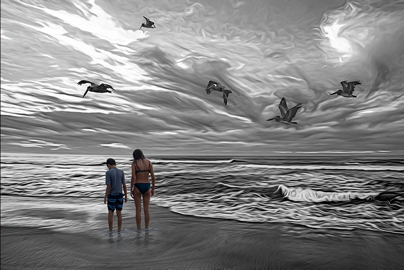 I think your filters stylized a marvelous sky and wave movement into something very different and interesting. The rhythm of the pelicans flows very nicely with the clouds. Adding your daughter and son without stylizing is a really interesting contrast, adding a bit a mystery which is enhanced by the focus of their gaze.