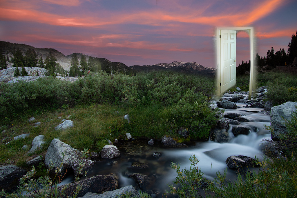 The open door feels inviting to me, but it doesn't give much of a view of what's beyond unless you move it very close to the viewer. Just a door frame might make a better portal, or a door that's open further and opening outward so we can see what it is.