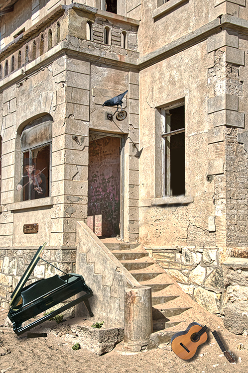 The broken instruments do evoke for me the loss of their music, and there is something very sad about them. The ghost playing the violin, separate from the instruments but still connected, reinforces that for me. I really like the way his coat blends into the shadows of the interior of the building.
