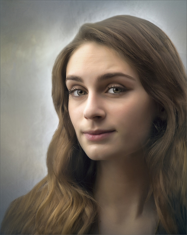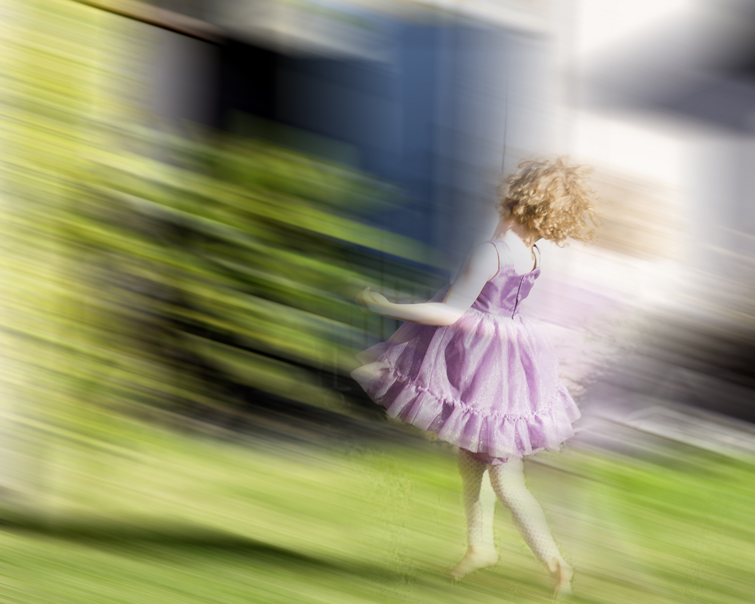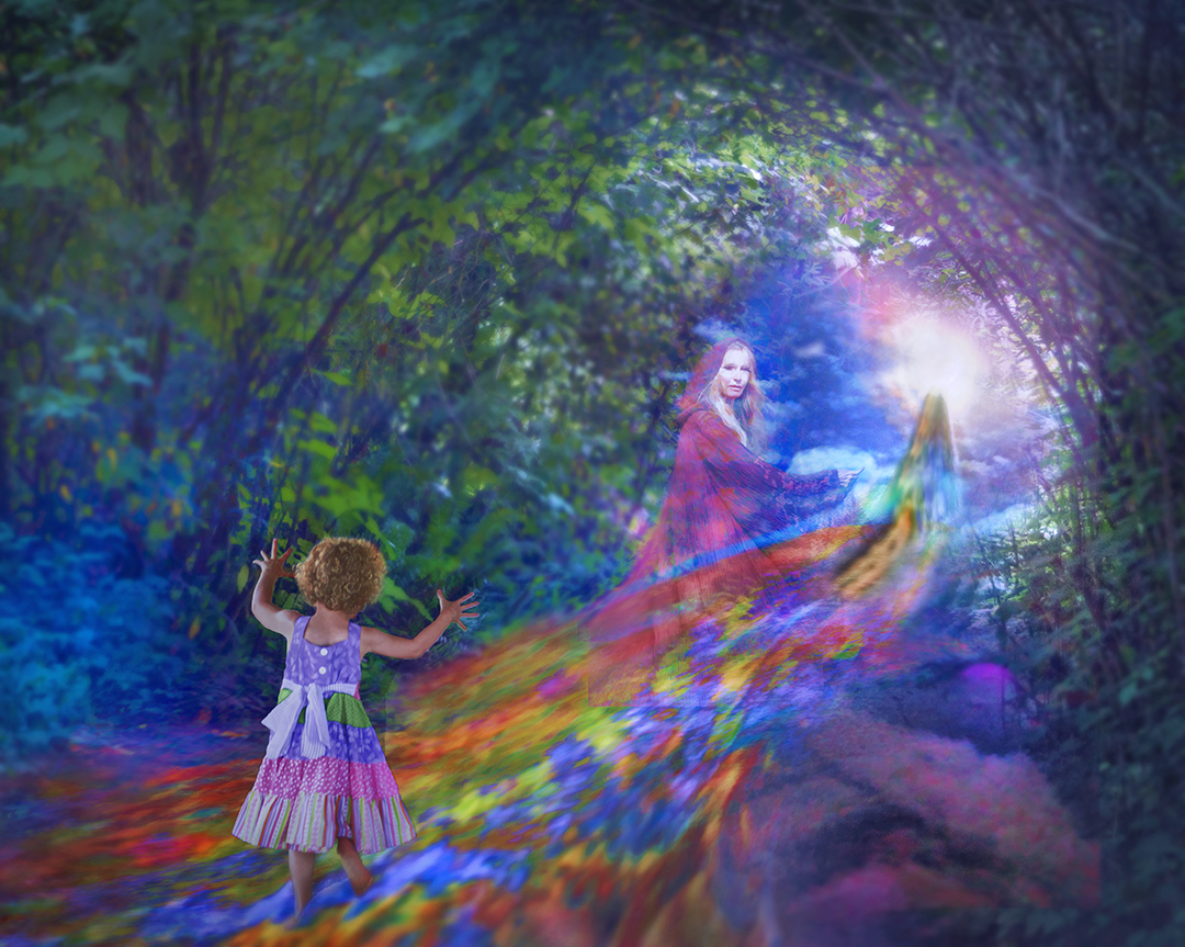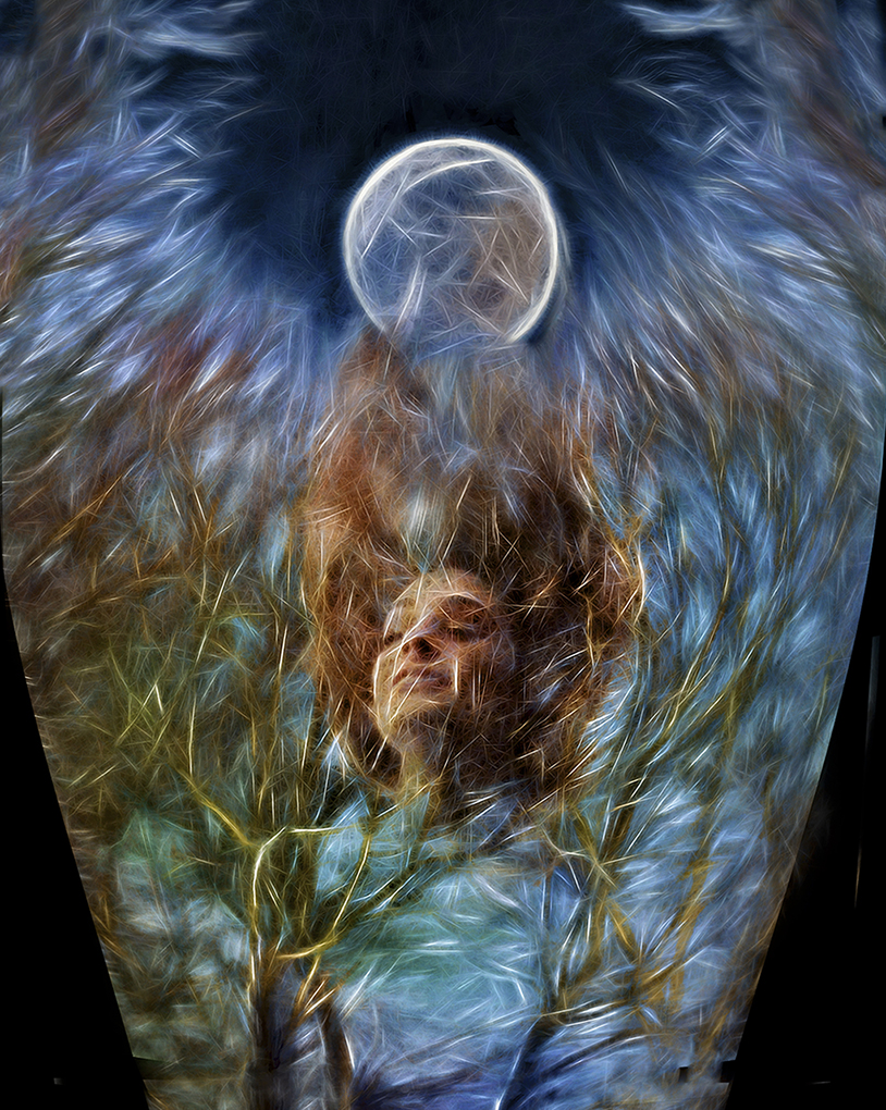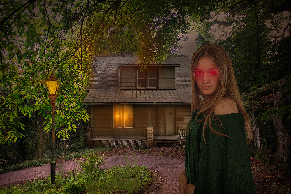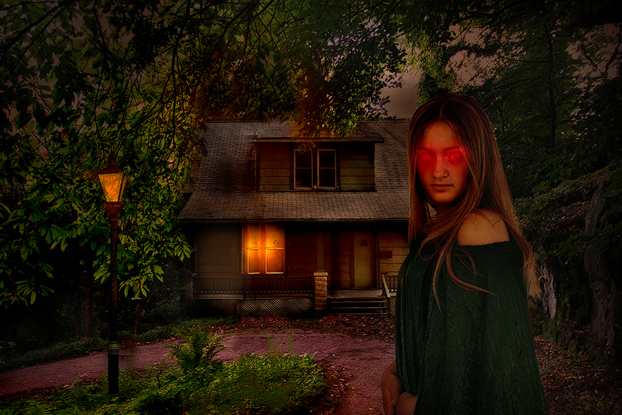 Those glowing red eyes are eerie, and her expression is great. I like how your granddaughter and the drooping branches frame the house. I think the golden glow in the window looks great.