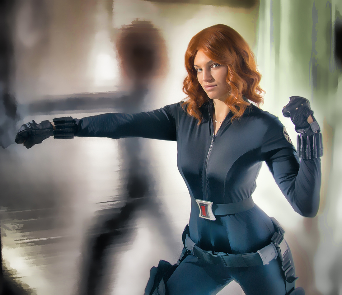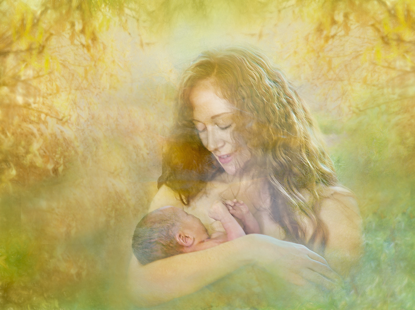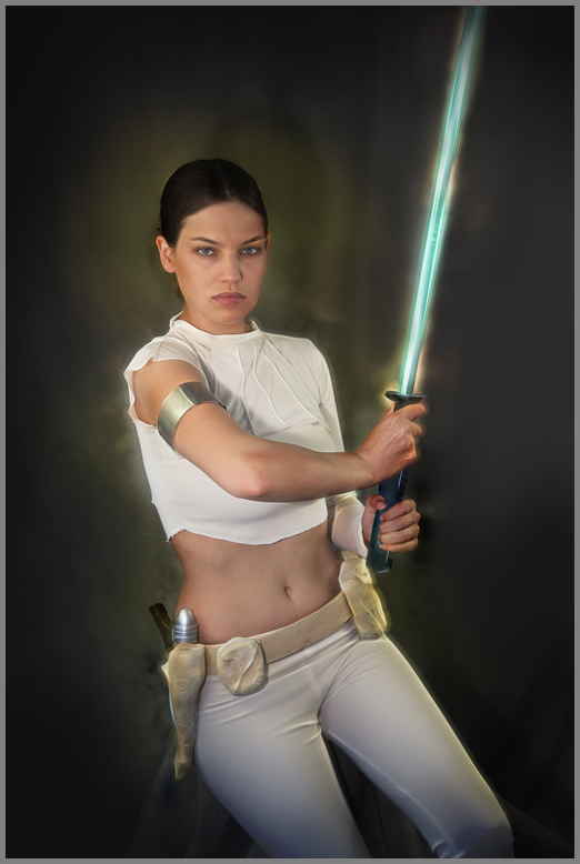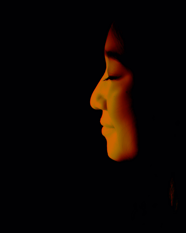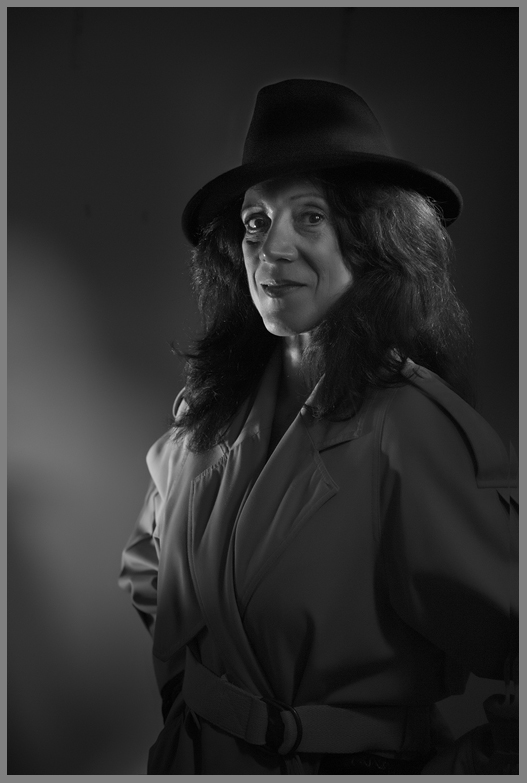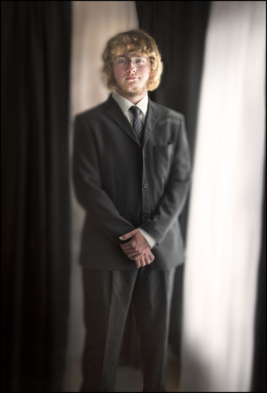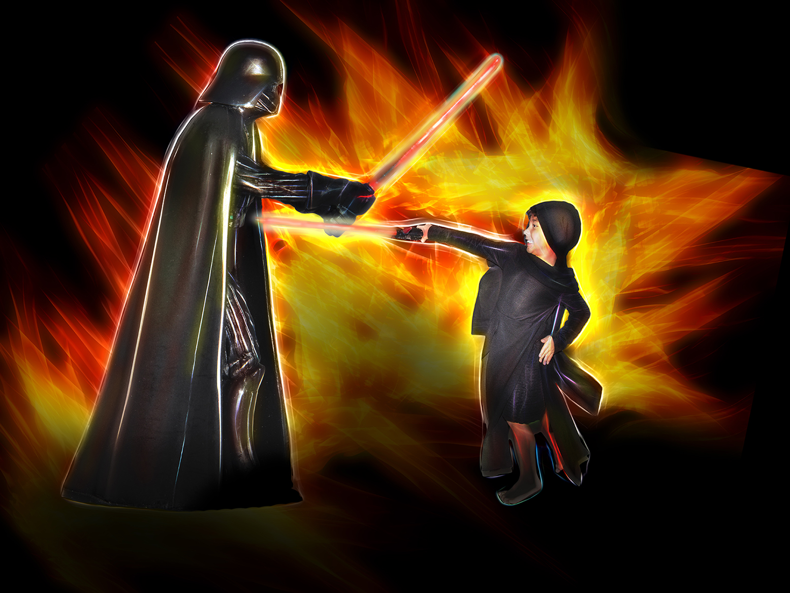 Those glowing red eyes are eerie, and her expression is great. I like how your granddaughter and the drooping branches frame the house. I think the golden glow in the window looks great.
