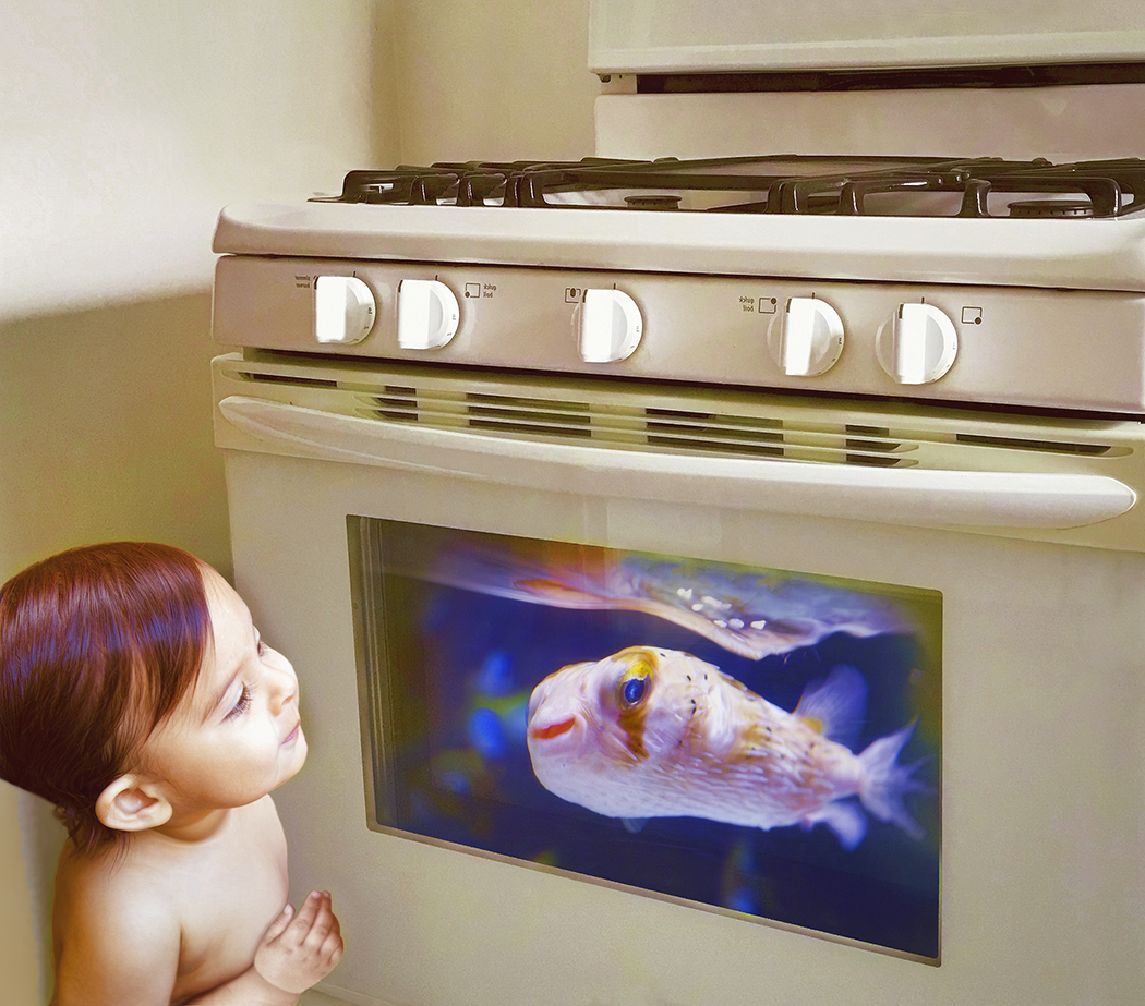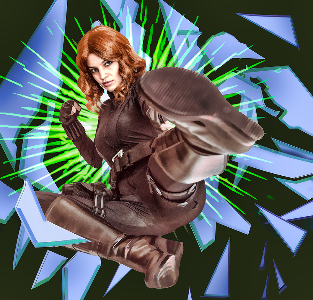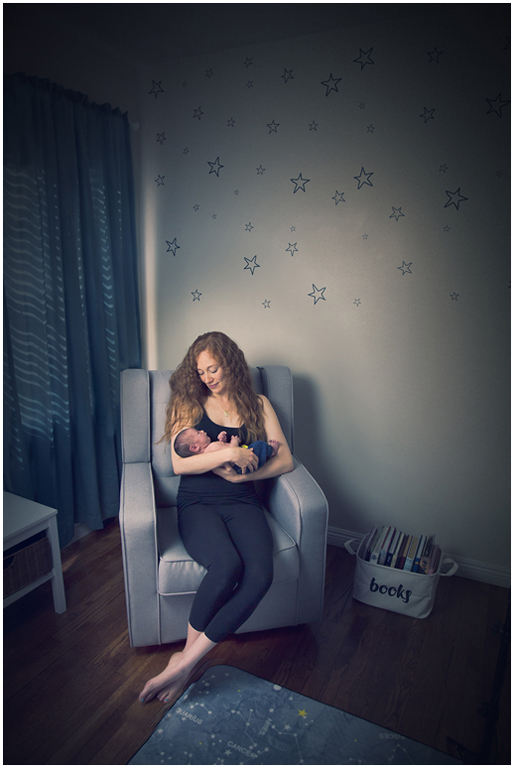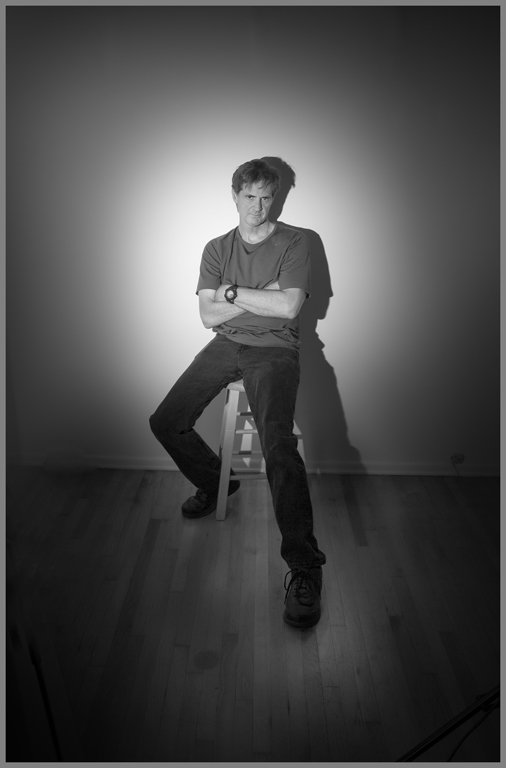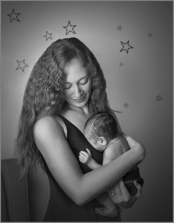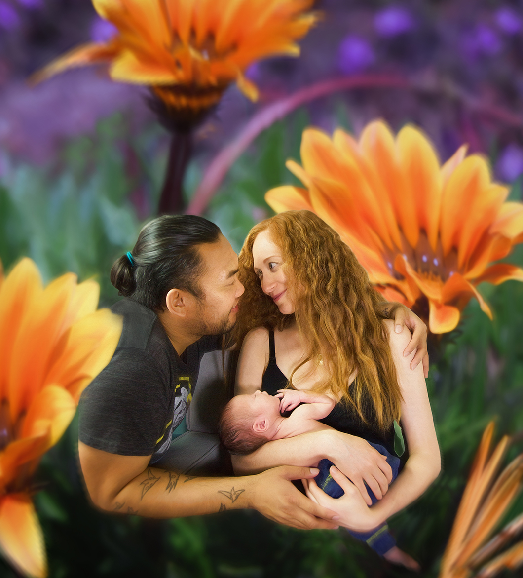Those glowing red eyes are eerie, and her expression is great. I like how your granddaughter and the drooping branches frame the house. I think the golden glow in the window looks great.