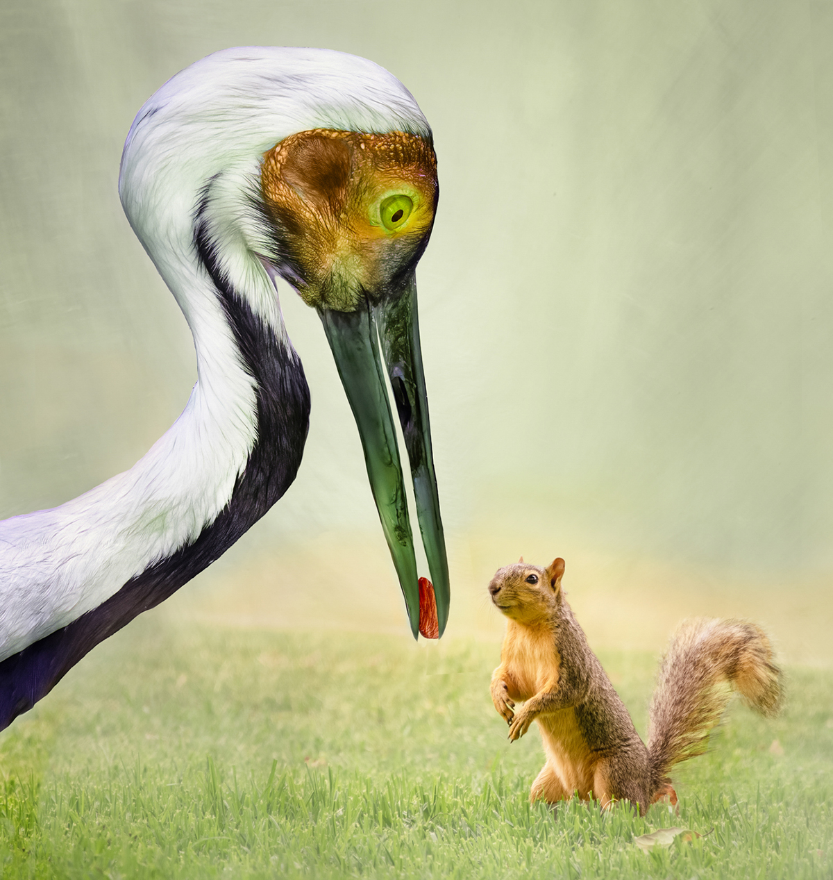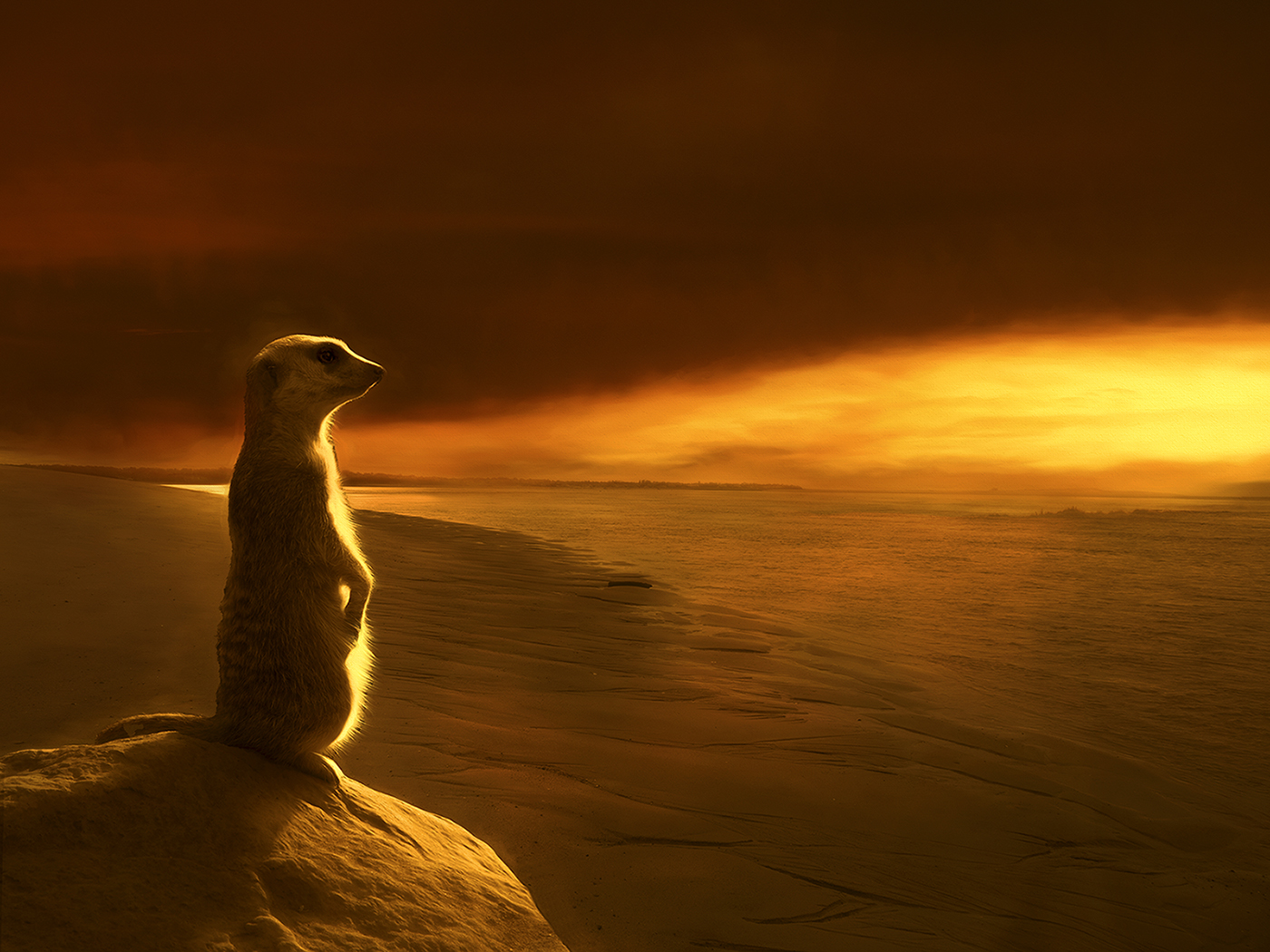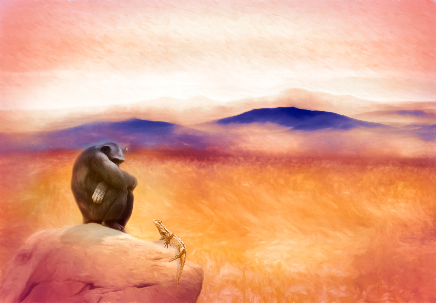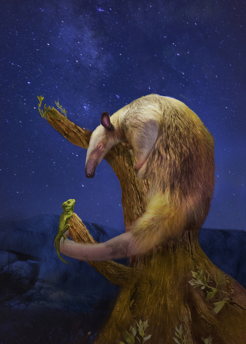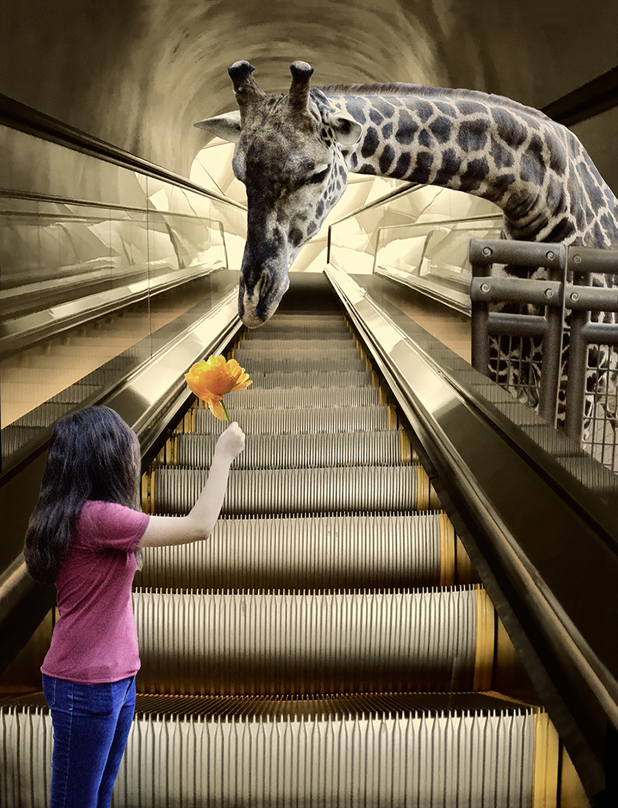 The sweep of the mountain range on top and the trail on the bottom lets my eyes explore the whole image and then brings me back to the deer being placed. I love how everything is desaturated except for the "hand of God". The deer is in such a great pose, both being interesting looking at the viewer as well as, with the hand, looking like a toy.
