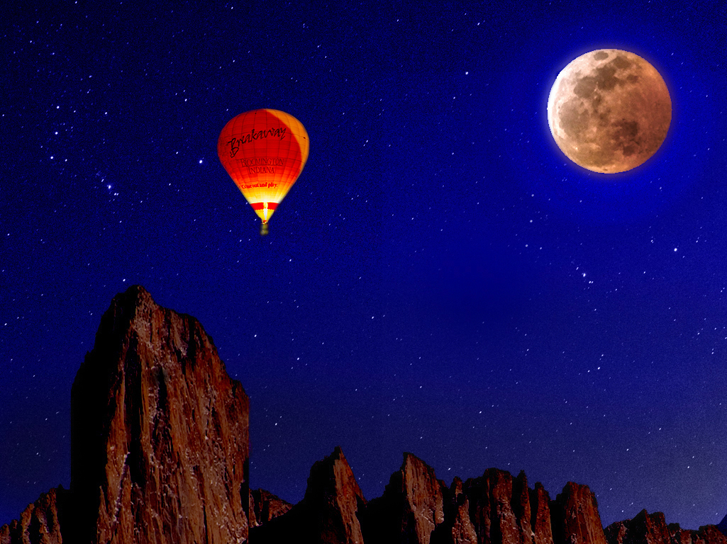 I love that balloon floating up in the night sky over the cliffs to the moon. The balloon's colors are a nice complement to the color of the night sky. The message on the balloon is perfect for this image.