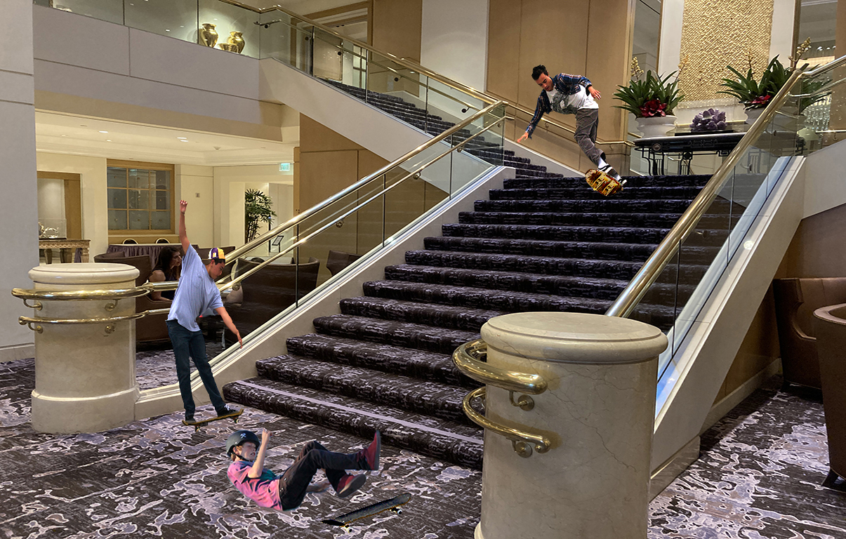 I love the staircase. I think the boys are well placed, forming a nice triangle of disaster in progress. I don't have any problem with the boy on the left facing the stairs - he could well be executing a spin, or maybe he's just tooling around the area popping wheelies.