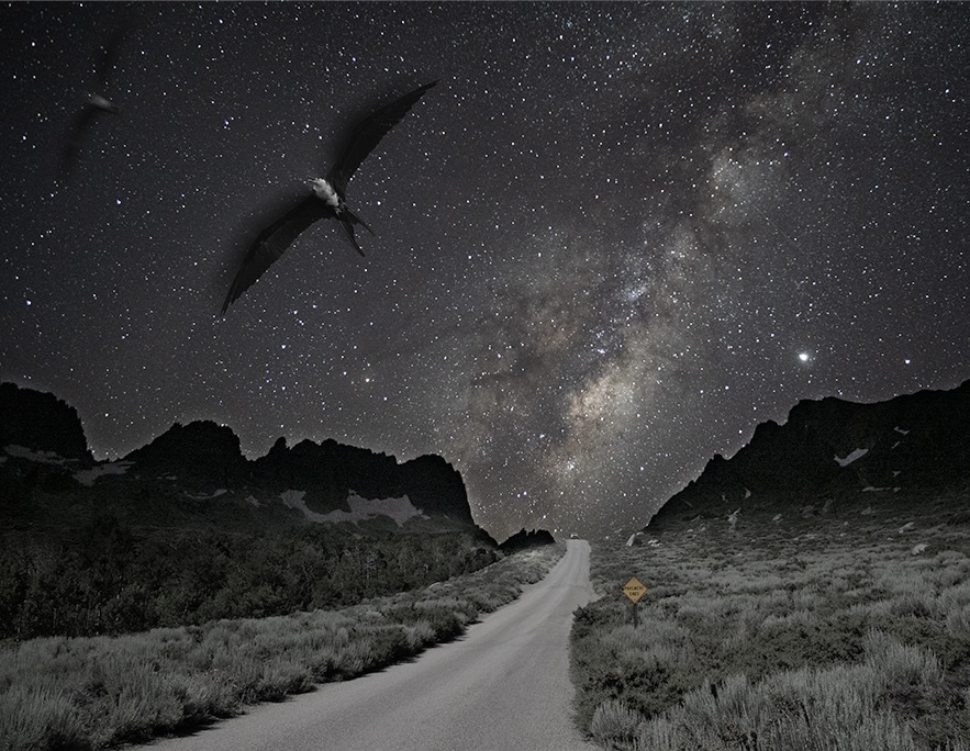 The birds feel a bit disconnected from the road and Milky Way.