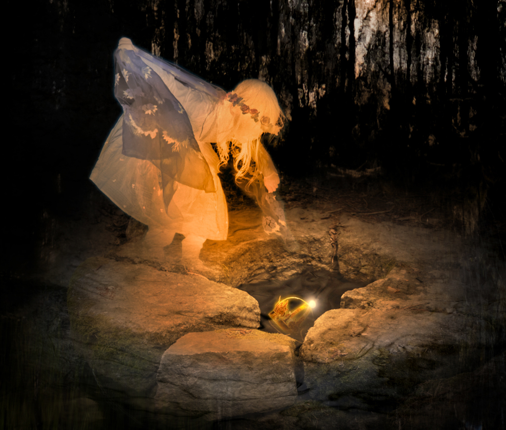 The little spirit girl's gesture looks just right to me, with her hovering over her discovery. The Pearl 's light draws my eye immediately, and makes me look at the crown that it's resting on. I think the dark forest background gives a good sense of place without distracting from the story. I like the balance of your composition.