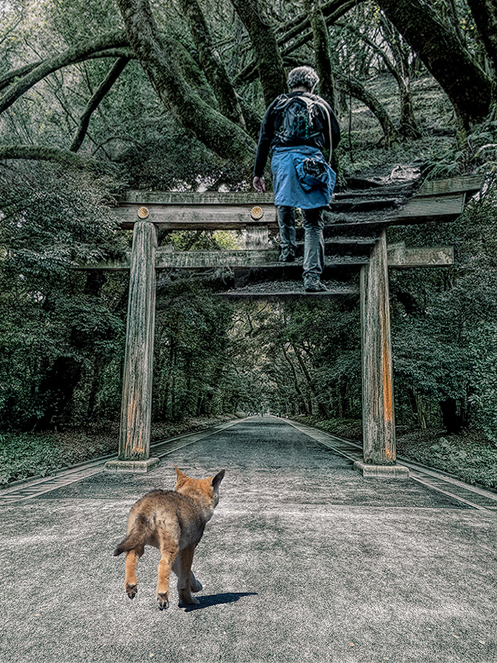 I think this image is really intriguing, Brad. You've blended all the elements beautifully. For me, the version with the fox is more interesting because the fox feels more actively connected to the man than the monkey. I think the orange of the fox is a nice connection to the orange in the structure. I. really like how the structure blends with the stairs.