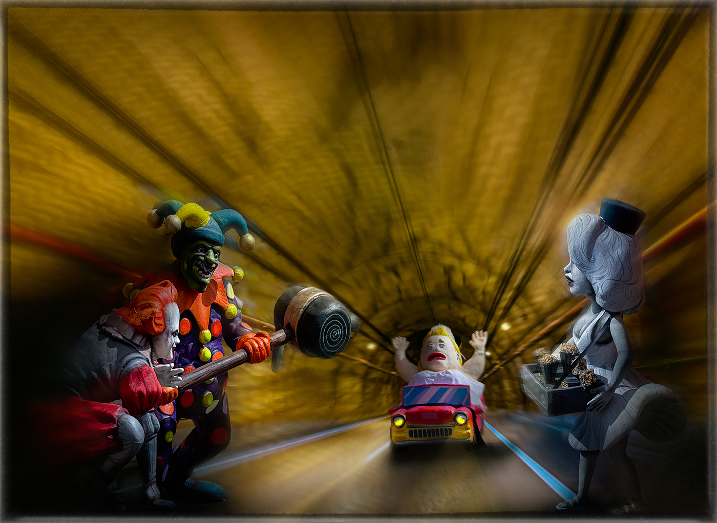 This image is both terrifying (evil clowns!!) and funny for me. I think it works really well. The villainous clown and jester on the left are balanced by the impassive lady on the right, and the helpless car's occupant is bearing down inexorably towards them all. Every one of them has an expression and body language that tells a story. Your composition really gives me the feeling that they are in a long tunnel. The motion blur and the tunnel's lines reinforces the feeling of speed I get from seeing the expression on the face of the car's occupant. I like how the colors of the car match the clothes of the evil doers, and how the lady on the right is as colorless as her expression.