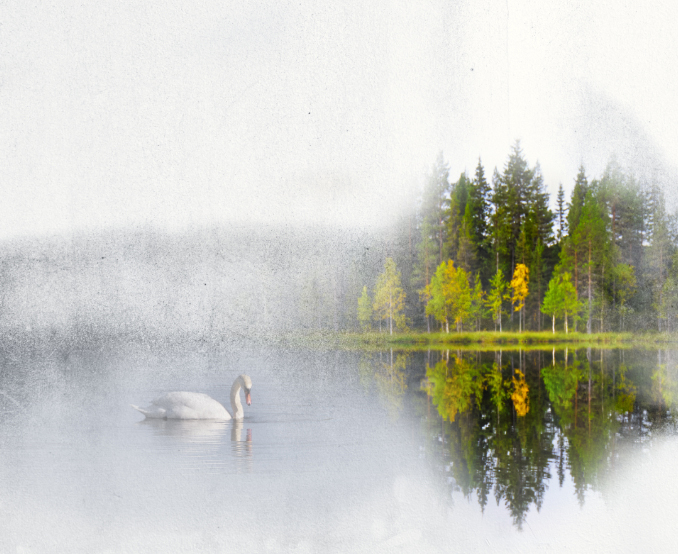 The center and the left side of the image feel very natural to me. I like the symmetry of having the swans bracket the island, but the dark line circling the swan on the right feels less natural than the left side of the image. Personally, I would consider cropping it, or adjusting the texture.