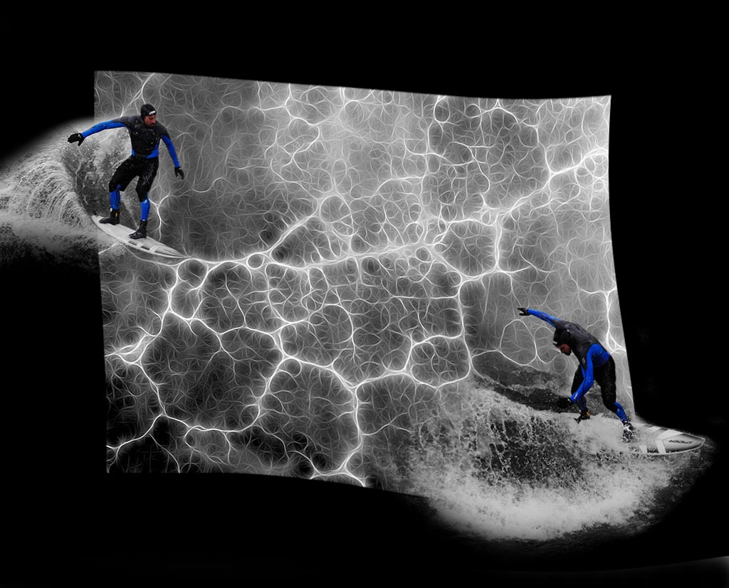 What a cool image, Brad! I love the energy of the sparking background, and how everything is b&w except the blue parts of the surfers' wetsuits. The waves look very natural to me, and their placement gives me a dynamic feeling of balance in action. I especially like how the surfer on the left seems to be surfing onto an energy line.