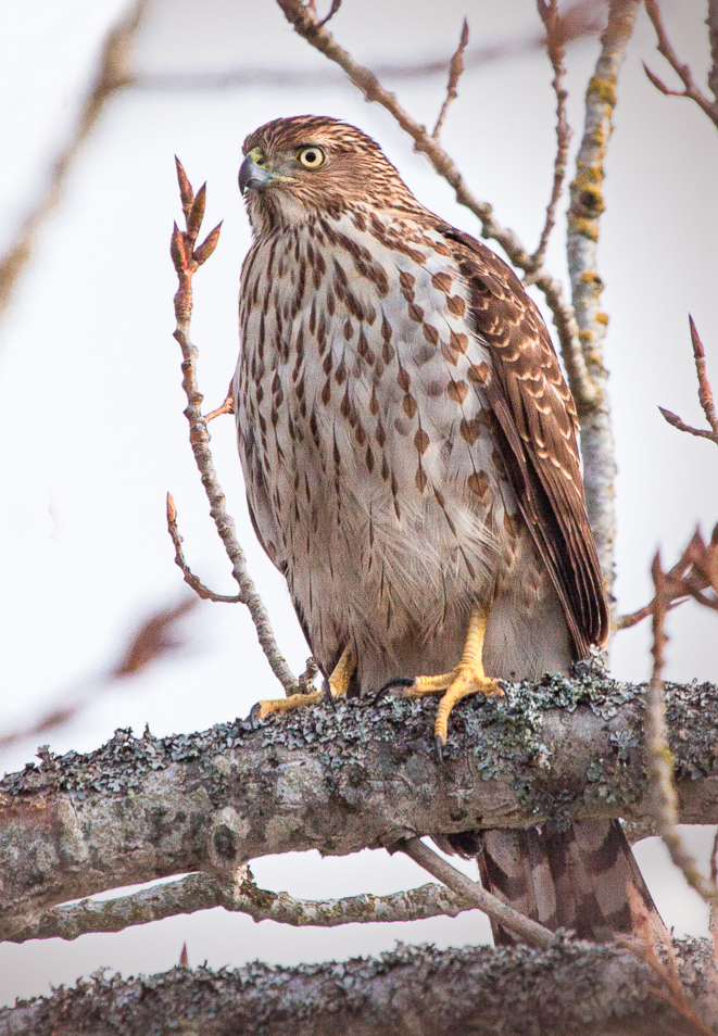 I looked it up and am still not certain but I think it's a juvenile Cooper's Hawk, as you said. Frankly, I couldn't decide if I would remove the branches or not so I played with it and removed the sharp ones on the left, then cropped in from the upper left corner. I looks better to my eye. |