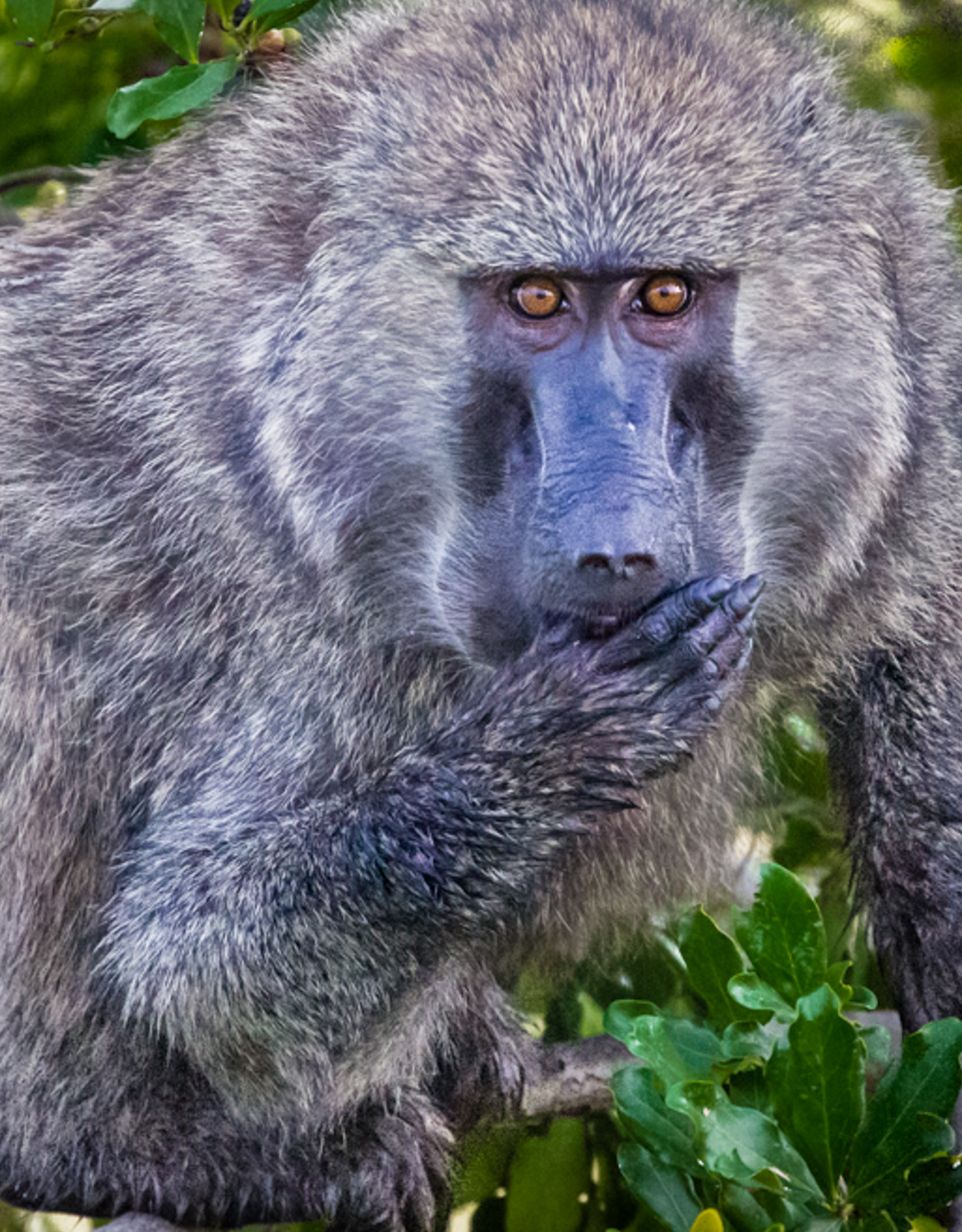 I love this image but don't like the crop. The star of the show here is the baboon's great expression. (Love the Title too.) I cropped in much tighter, added some sharpening and clarity to the face and eyes, and did a bit of burning to darken the snout and a bit of the fur. I found an area on your image on the body that was a bit to purple in a shadow area there (at least to me on my monitor). Maybe men at a certain age start seeing purple! Without addressing the shadow whatever I did removed it. I did move the slider just a touch toward the yellow, which may have done it. Congrats on a wonderful playful image. |