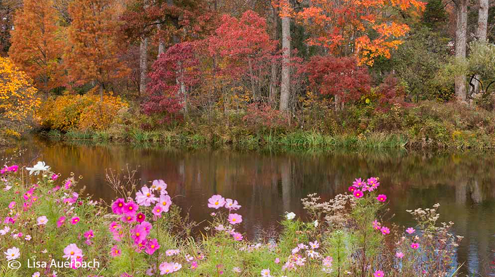 Very pretty but it looked a bit flat to my eye. I also thought a crop off the top would make the composition stronger. I wasn't sure if I liked the bare trees against the sky with so much nice color below. See what you think. I also added a touch of contrast and clarity. I would also, looking at it now, clone out the flowers on the very bottom right that are cut off. You could crop them out but then I think the edge would become too close to the tree trunk on that side. |