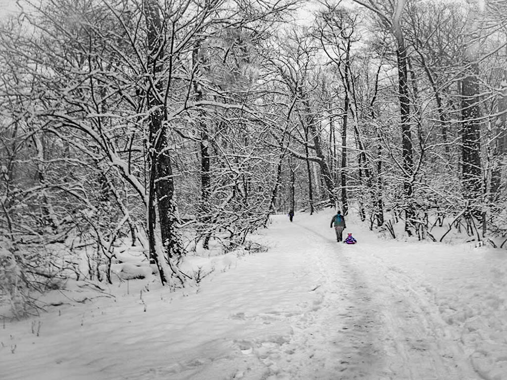 Before I read your description I thought how much I liked the scene but felt it was underexposed. Snow generally needs added exposure to avoid coming out grey. I boosted the exposure and there appeared to be some vignetting, especially on the lower left. I went to effects in LR and brightened the corners a bit. finally I added a bit of clarity.