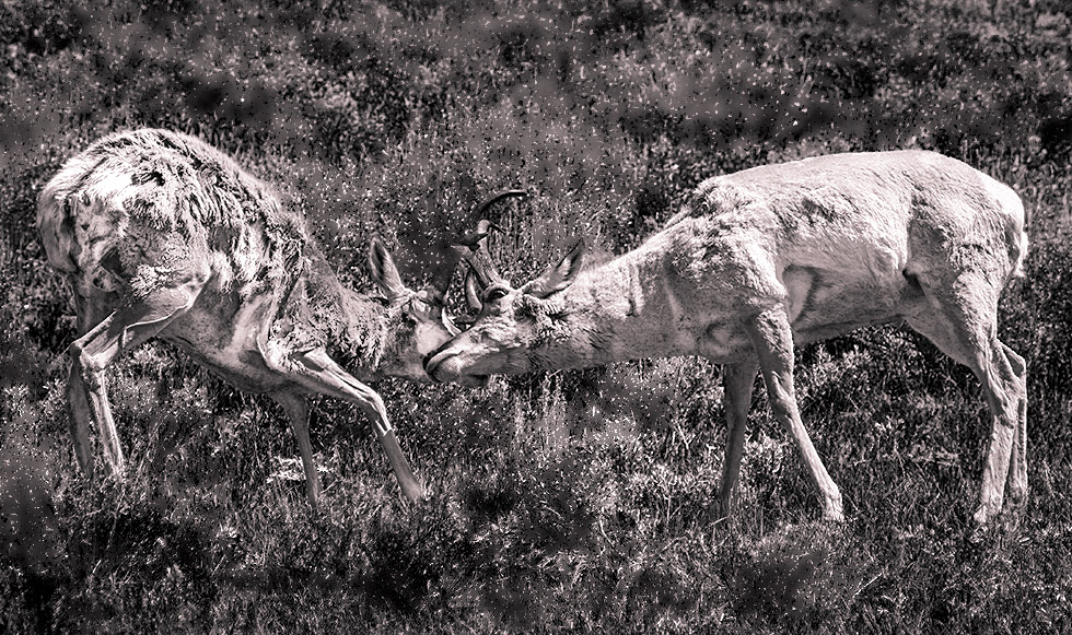 I again agree with the others comments. However, the subject matter is so good I would spend some time playing to see what you can come up with. Maybe go abstract with some wilder effects. I did a fast sloppy black and white, attempting to darken and blur the grass and lighten the animals just to give you an idea. |