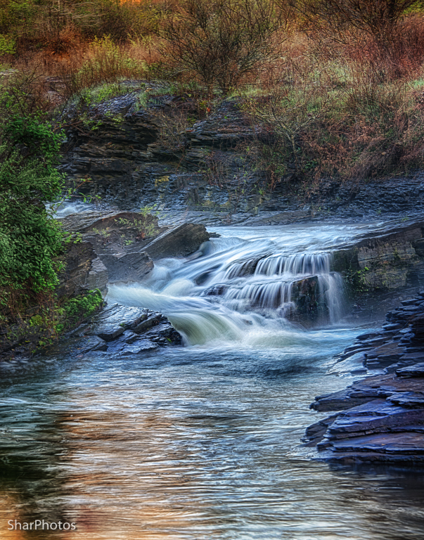 You are lucky! This is a lovely image and I think you cropped it perfectly. It's possible it's a monitor thing, since in a few other comments greens have looked too bright to me but not to others, but just in case: My eye is distracted by the bright green bush on the left. While I love the colors in the background, I think they compete with the wonderful complex waterfalls in the stream. I played with a copy with a lot of dodge and burning. I added clarity and saturation to the stream and desaturated the aforementioned bush. Looking at it, I can't say that I like mine better, it's just a different look.