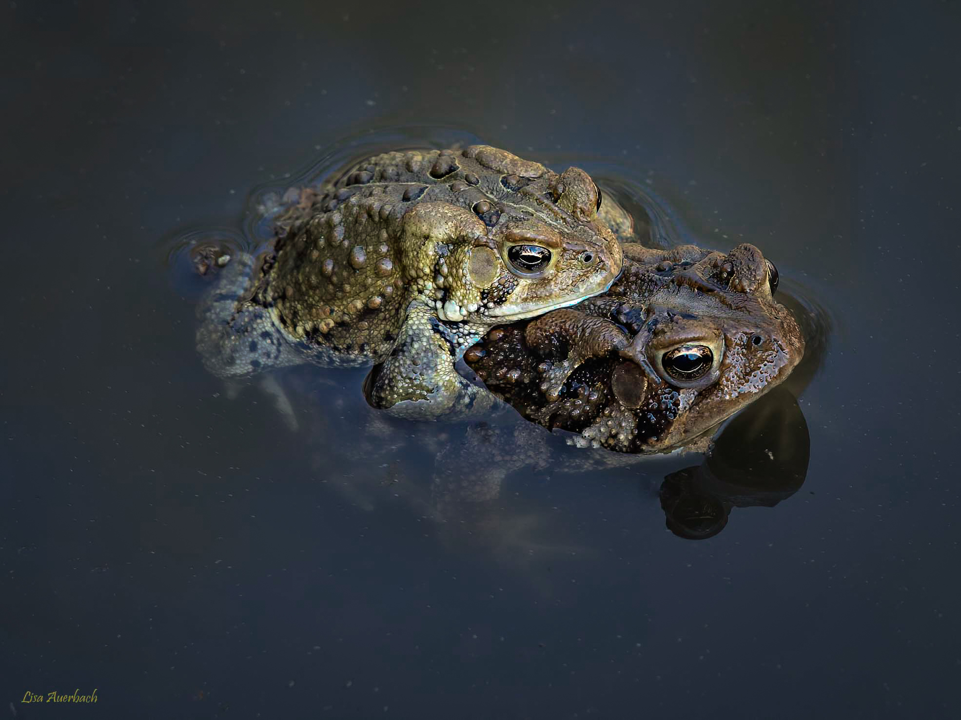 Nice shot of this intimate moment. I decided to play and using LR radial filters added some clarity and color to the frogs and reduced the exposure to the area areound them. I then, under effects, added a vignette. |
