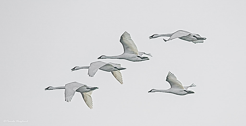 I like the different wing positions and position of these beautiful subjects. To my eye, the image looks underexposed. You might have had to blow out the sky to get the swans whiter. I can see a white halo around the birds which may have been induced or heightened by the adjustments that were made. I sacrificed the sky and brightened up the whole image and added some sharpening. |