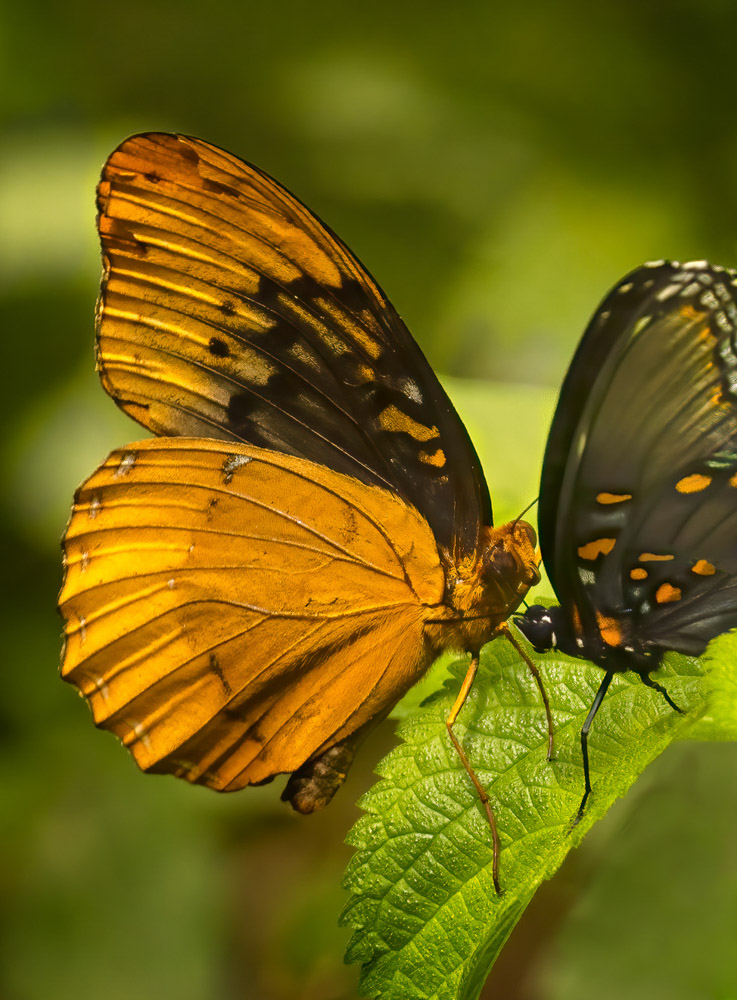 I find it very difficult to shoot butterflies as they don't allow much time between movements and often aren't parallel to the plane of focus. I like the interaction, and am attracted to the faceoff being shown. I am bothered a bit by the leaf in front of the Red Spotted Purple and it's wings are not as tack sharp as the other butterfly. I also liked the dark background in the original and wanted to tone down the green leaves behind the subject. For fun, I did an aggressive crop and used content aware to remove the leaves as shown. I used Topaz sharpen selectively on the upport portion of the dark wing and also darked the background, desaturation the green a bit as well. |