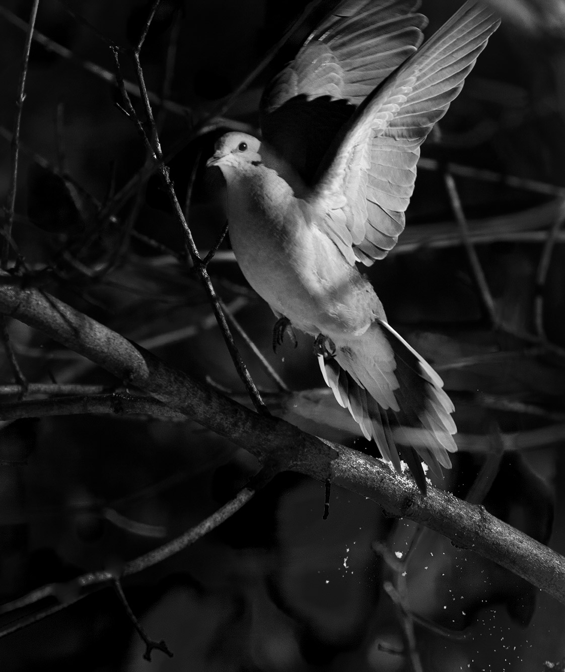 Hi Allison. I'm a bird shooter from group 52. Living in Florida, where we have an abundance of birds, many of which are used to people and relatively easy to get close to, it has become my favorite local target. I'm always in search of background where I might be able to get a bird in an interesting composition. I like the bird's position and the falling snow, which tells the takeoff story well. I'm not a fan of the background, however. I thought I'd play with your image to see if I could address that concern. Using just Lightroom I rendered it as a black and white and darkened a lot of the background, in particular the bright branches which may have competed in my eye with the subject. Bravo on getting the head and eye sharp, the key to a good image in my opinion. |