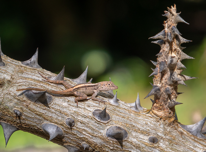 Hi Janice. Andrew invited me to comment on your very nice picture. I think this image successfully breaks the "rule" to have one main subject, as I see the thorny plant as an equal co-star to the little lizard. My only thought would be to consider cropping a bit to take out the background stem that goes along the bottom. I just used Lightroom but in Photoshop I might have rotated it more and added some canvas. Here's how a simple crop in LR looks. Nice job and Happy New Year.