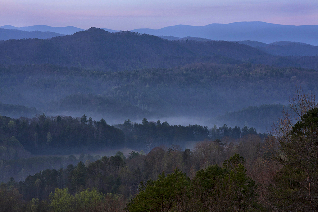 I very much like the original image composition with the fog rising from the mountains. I like the hint of blues and little pink on horizon. I think the edited version is a little over-saturated, and the Topaz detail too strong. I prefer the original image with soothing colors. My recommendation would be to make the image brighter, add contrast,and adjust shadows to bring separation between trees. I also used burn brush to darken horizon just a little (after I adjusted brightness); it added the touch of pink. I hope you do not mind that I used your image to show my recommendation. |