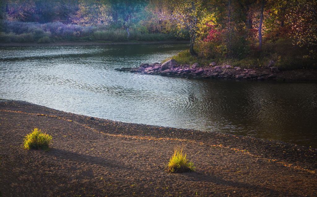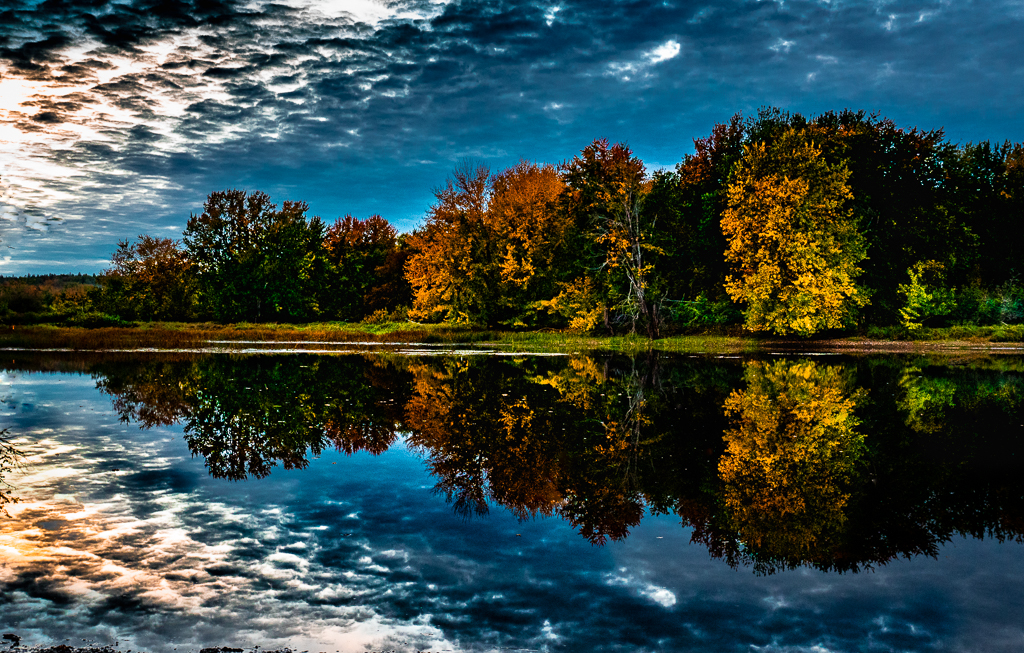 Many people who start out doing landscapes think that they must use a wide angle lens to capture the whole vista and as a result they don't have a point of focus. You probably use other lenses but this image suffers from too much wide angle. As a result we have a large expanse of plain water and a far off picture of what might be interesting foliage. I suggest you crop the image inside the small tree on the left and crop 1" to 1.5" off the water. I would then zoom in to try to bring out the more detail in the sky and the rest of the picture. |