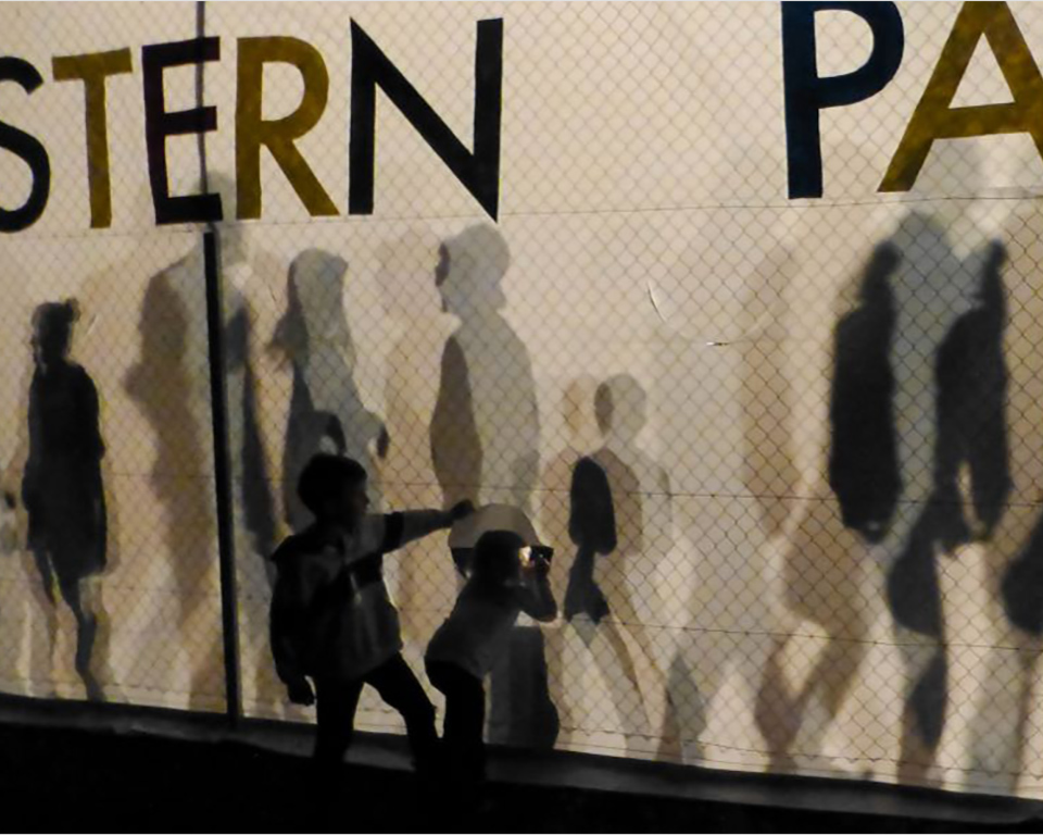 Nice layering to your story, Liz - in front of the fence, the fence, and behind the fence; and the window provided by the children. The monochromatic colors simplify the the image and the shadows (ghosts) add to the story. Capturing the image on the diagonal adds perspective to your image. A suggested smaller version is included, which brings the children on the "thirds" and eliminates the post and right edge. Not including the full word "park" does not detract from the image. A stroke around the image helps the viewer with the black digital background. |