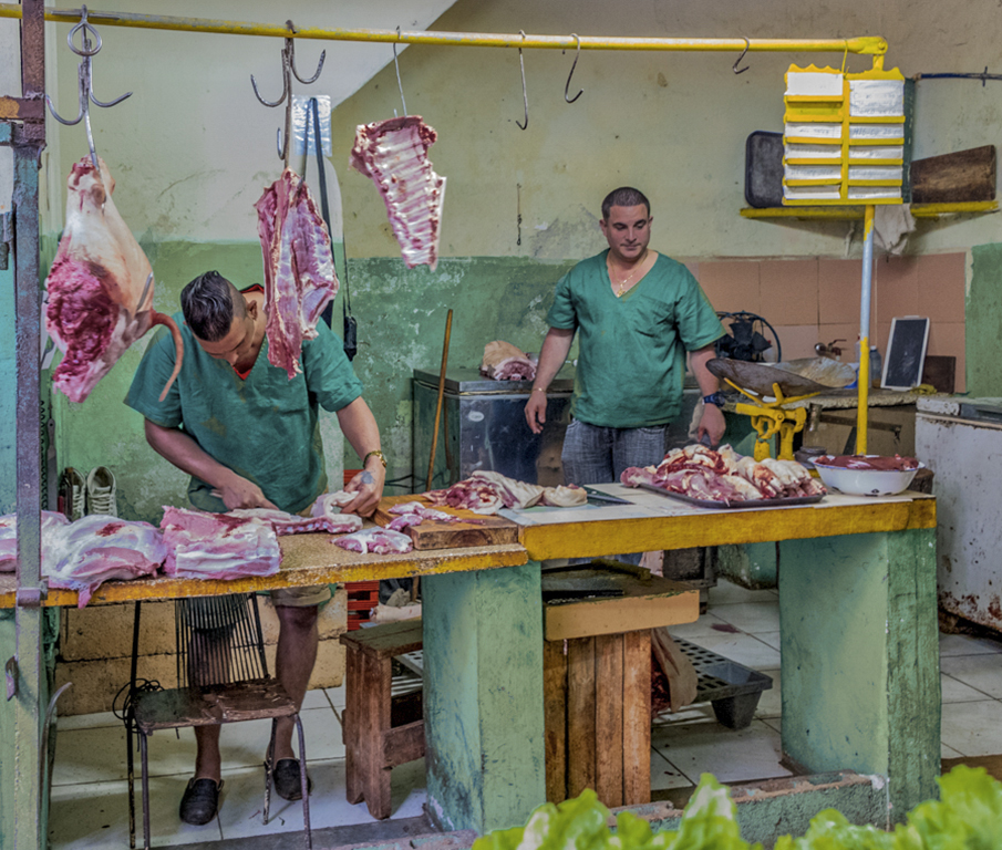 Very interesting image, Isaac. There's something waiting to discover in every nook and cranny- the pair of sneakers carefully set aside against the wall, the pig's tail acting as a leading line towards the butcher's hands, the yellow price? menu hanging on the frame. The butchers are separated from the background and the hooks and pipe stand frame the subjects naturally so there's no need to eliminate this important element. The butchers' shirts are so very similar in color to the background wall, please consider a warming photo filter on that part of the image as suggested below. |