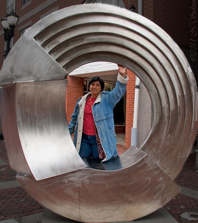 Interesting piece of art and the model framed within the circle adds interest. Perhaps a square crop would enhance the circular frame... as to me the background building and the concrete base of the art piece are not as interesting as the sculpture. |